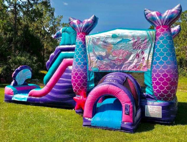 Under the sea is a Mermaid Themed inflatable. One of the bigger units we carry in the combo section. Great for backyards gatherings! This inflatable has basketball Hoop inside. This unit has two slides to maximize the amount of kids going down the inflatable. This is the dry price.